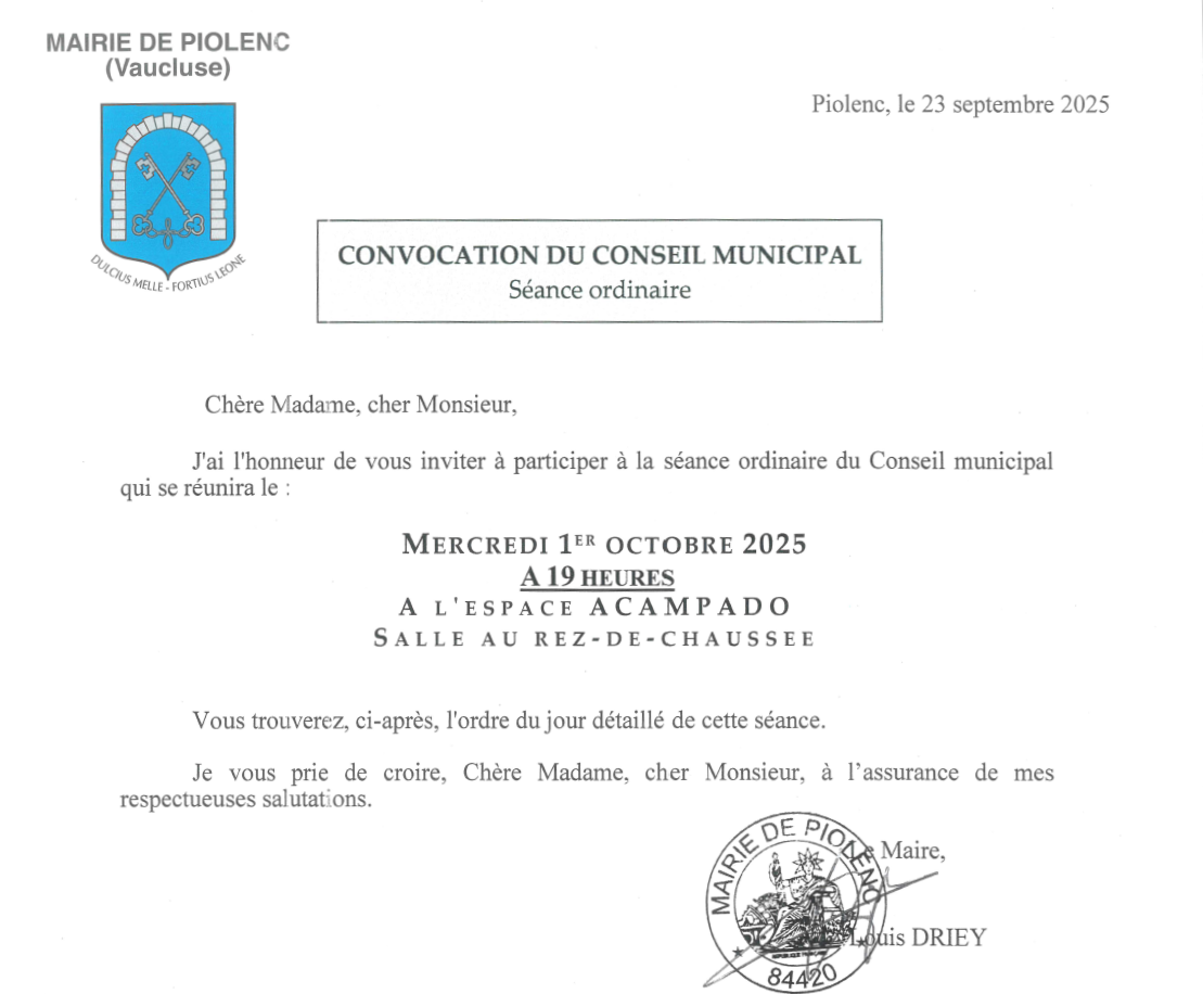 Convocation et ordre du jour du Conseil municipal du 1er octobre 2025